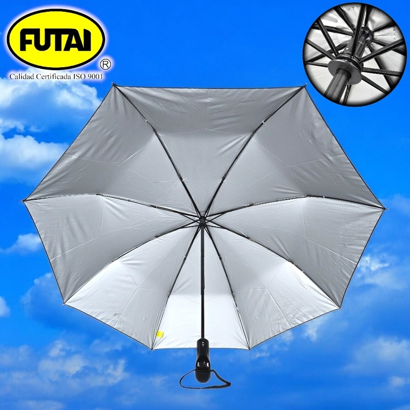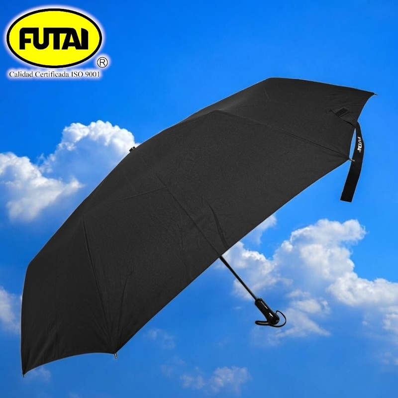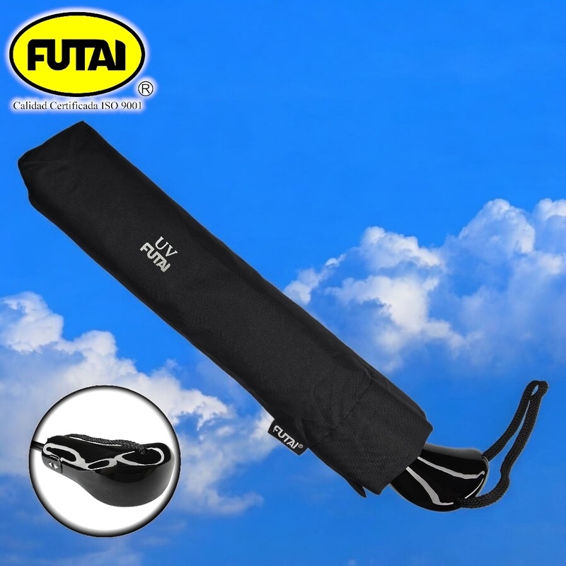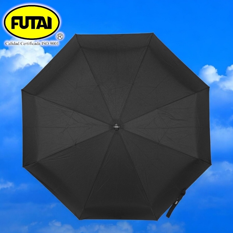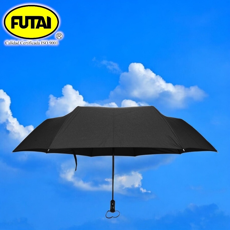 Paraguas automático de tres secciones, ocho varillas en aluminio y de polímero reforzado con fibras (FRP), puntas especiales, tejido Pongee 190T con capa protectora contra rayos UV, puño de color negro, tamaño 28 pulgadas (71 cm.= de radio. Disponible en color negro.