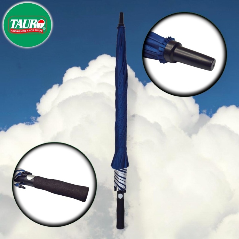 Paraguas manual tipo Golf, ocho varillas dobles y mástil metálico, puntas especiales plásticas, tejido Nylon con capa protectora contra los rayos UV, puño de Foam, punta plástica, tamaño 28 pulgadas (71 cm) de radio. Disponible en variedad de colores.
