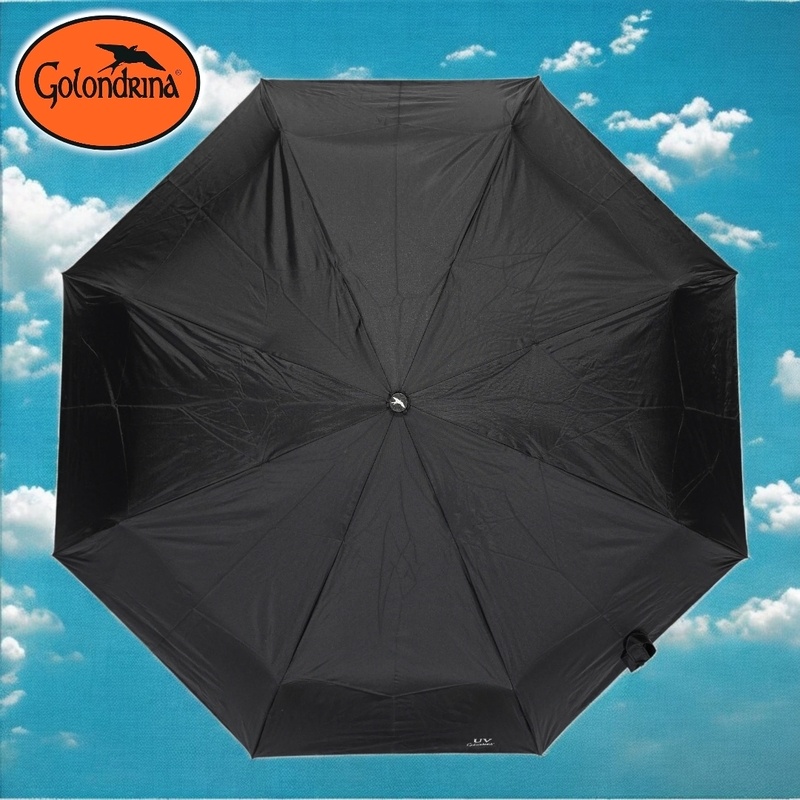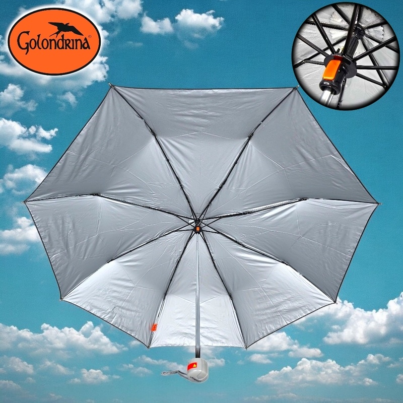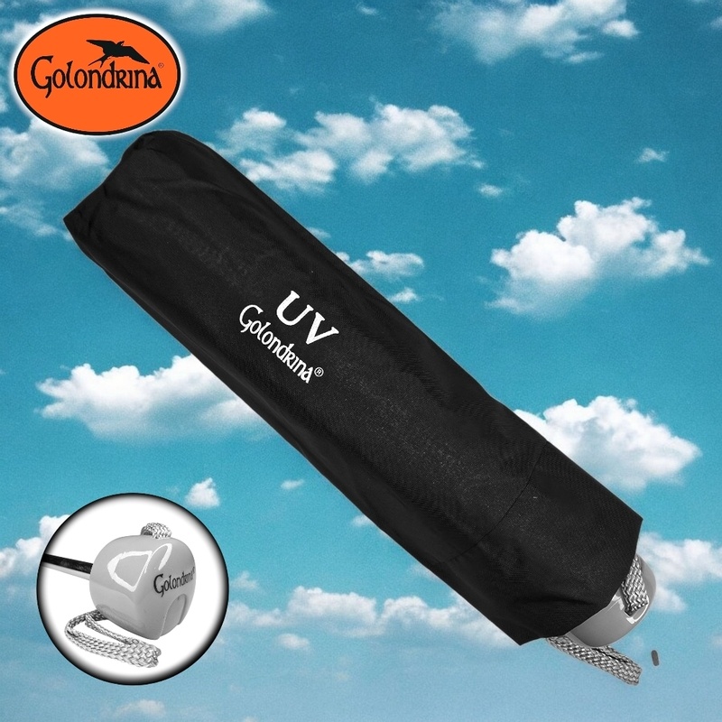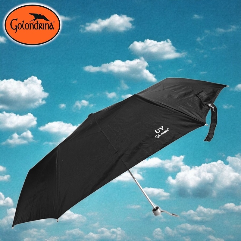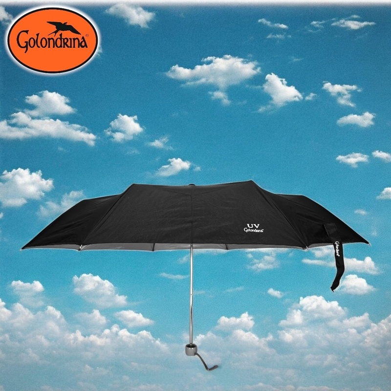 Paraguas manual de tres secciones, ocho varillas negras de polímero reforzado con fibras (FRP), puntas especiales niqueladas, tejido Pongee 190T con capa protectora contra los rayos UV, puño color gris, tamaño 21 pulgadas (53 cm) de radio. Disponible en color negro.
