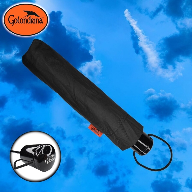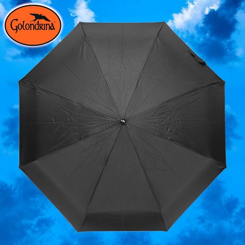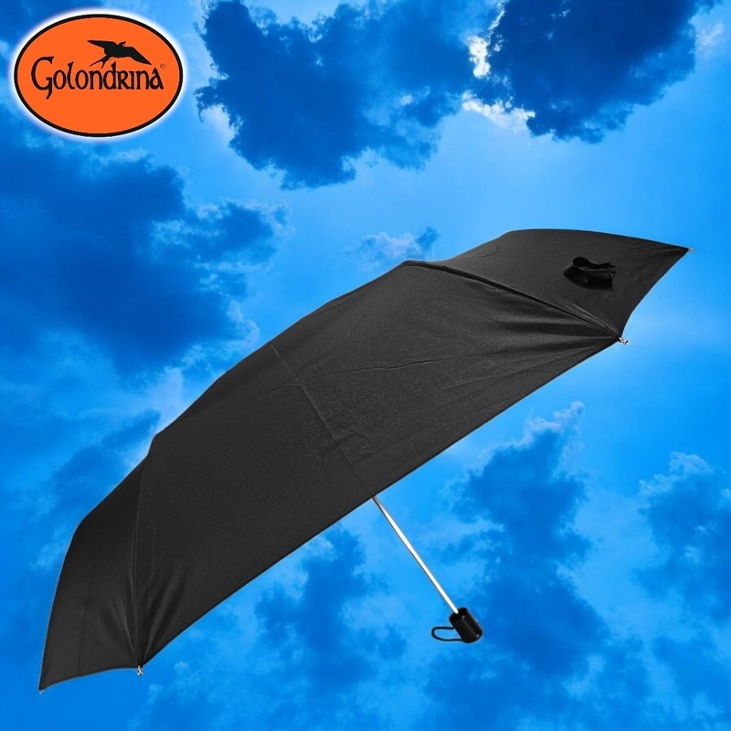 Paraguas manual de tres secciones, ocho varillas en aluminio y de polímero reforzado con fibras (FRP), puntas especiales, tejido Pongee 190T, puño negro, tamaño 27 pulgadas (69cm) de radio. Disponible en color negro.
