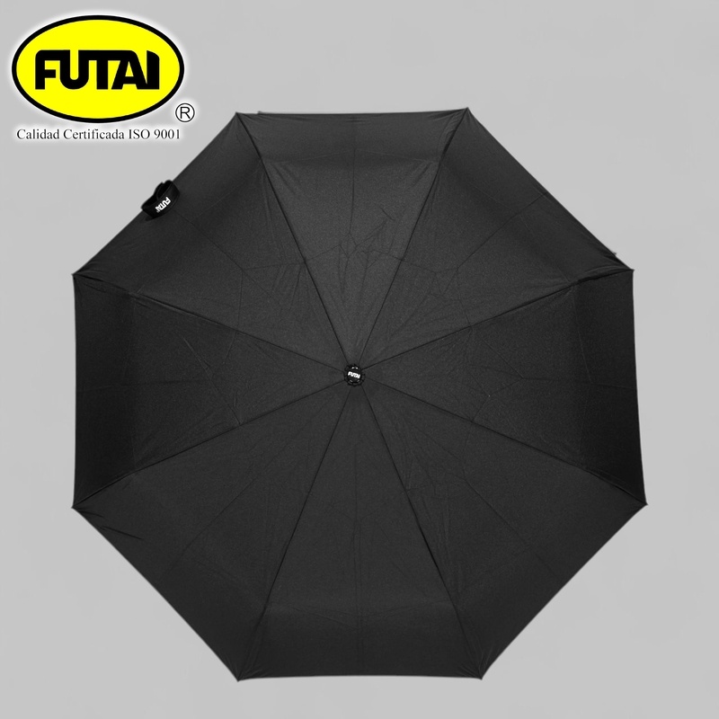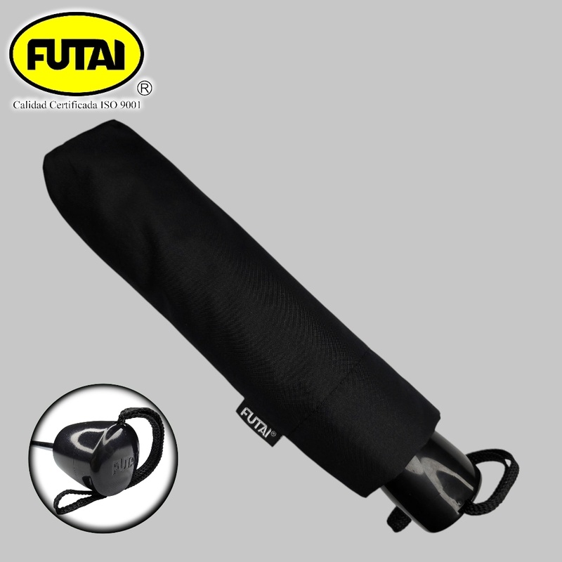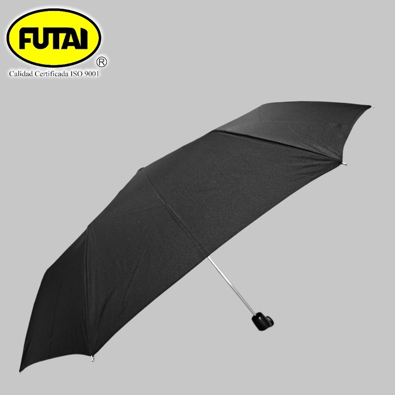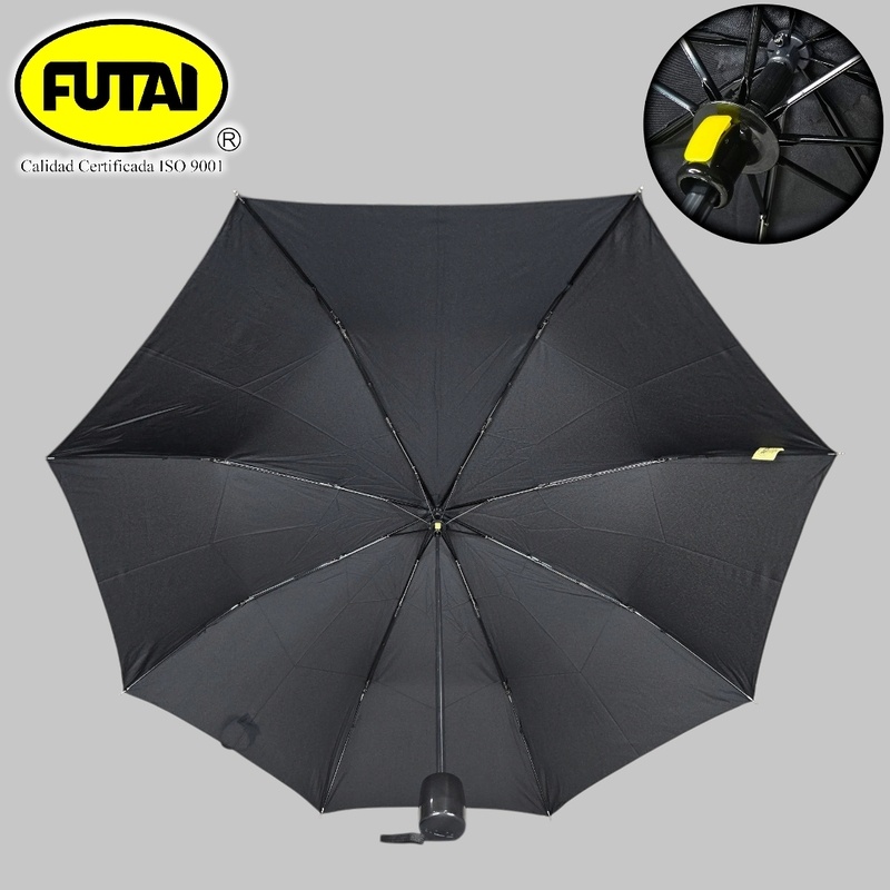 Paraguas manual de tres secciones, ocho varillas negras de polímero reforzado con fibras (FRP), puntas niqueladas, tejido pongee 190T, puño color negro, tamaño 24 pulgadas (61 cm.) de radio. Disponible en color negro.