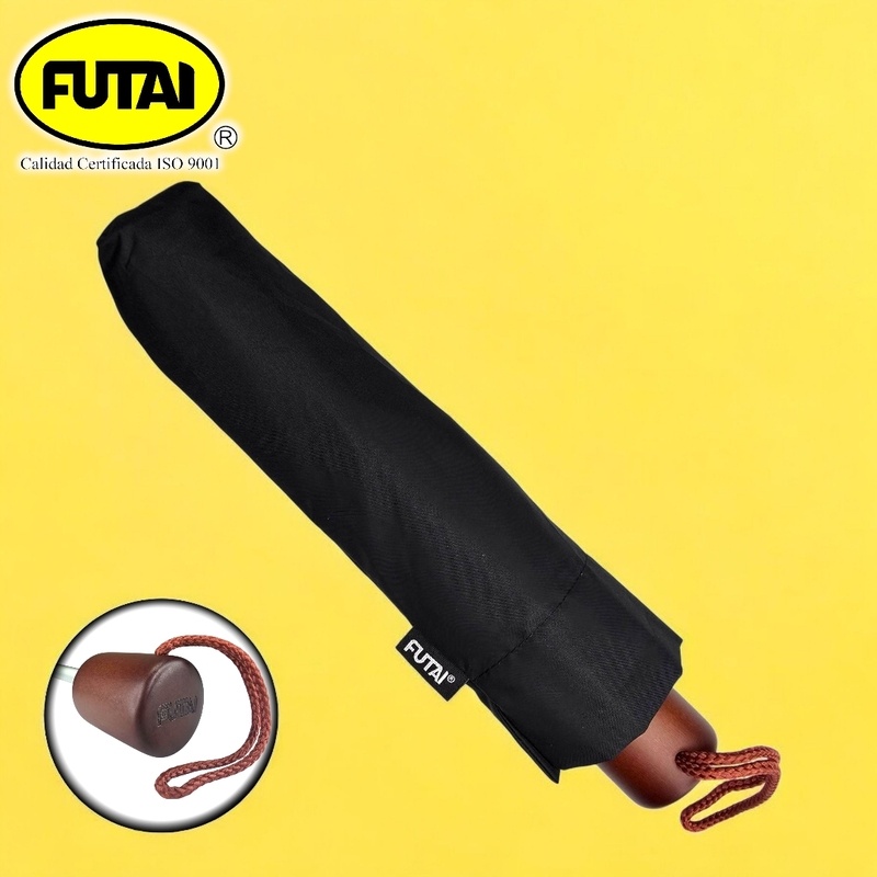 Paraguas manual con mástil en aluminio en tres secciones, ocho varillas en aluminio y de polímero reforzado con fibras (FRP), puntas especiales, tejido pongee 190T, puño de madera, tamaño 26 pulgadas (66 cm.) de radio. Disponible en color negro.