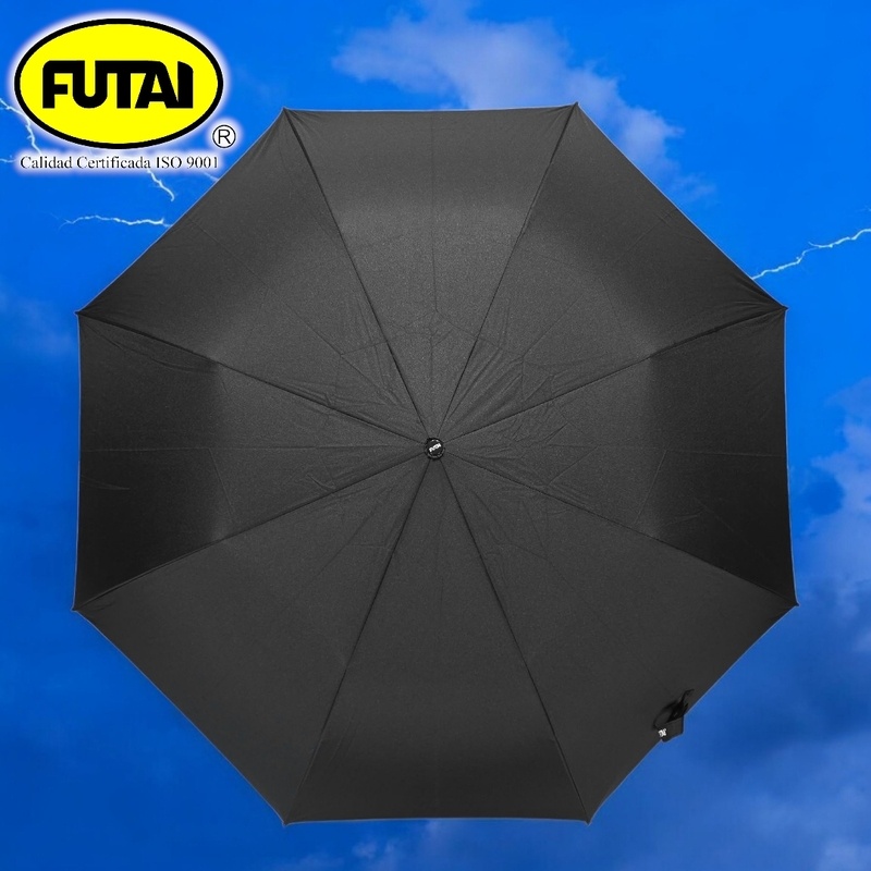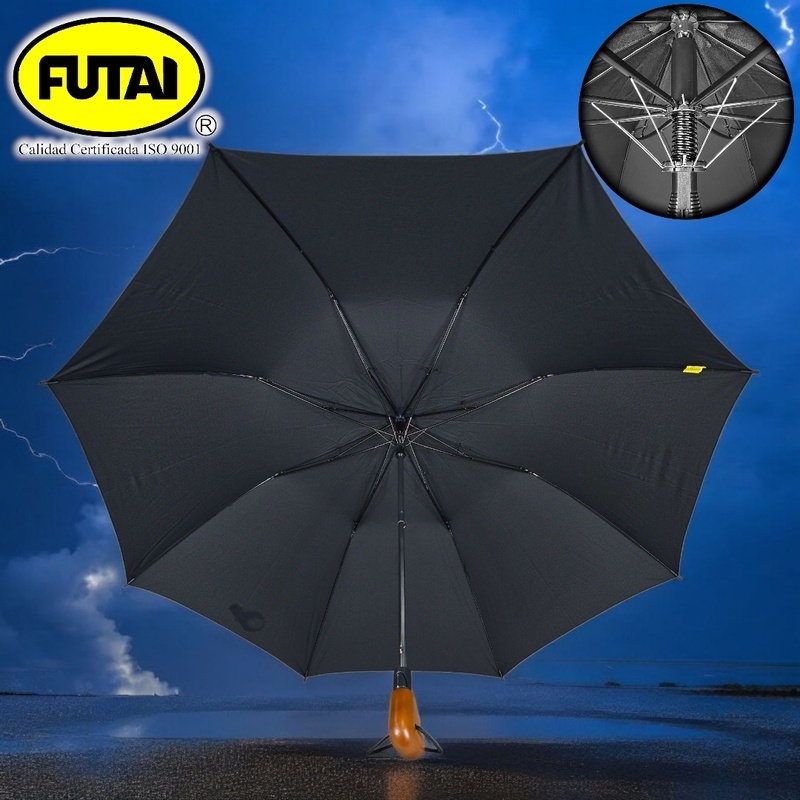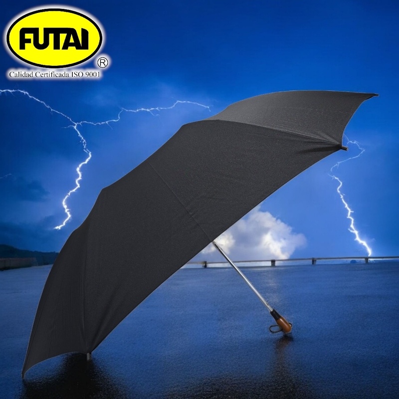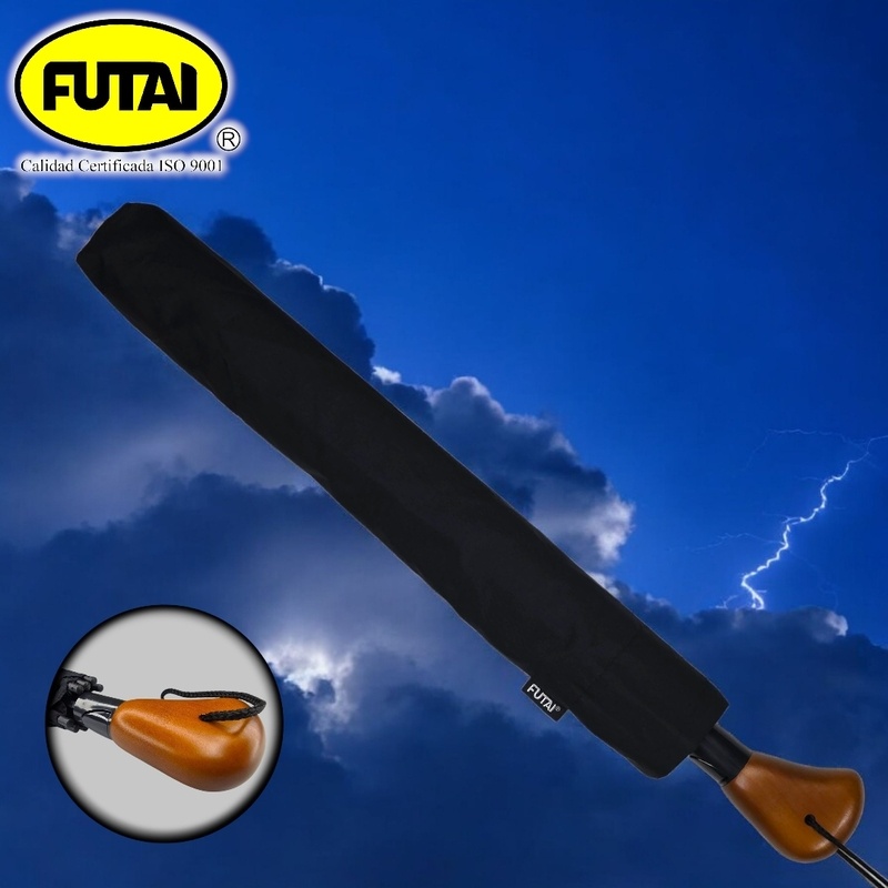 Paraguas semi automático de dos secciones, ocho varillas de polímero reforzado con fibras (FRP), puntas especiales, tejido pongee 190T, puño de madera, tamaño 28 pulgadas (71 cm.) de radio. Disponible en color negro.