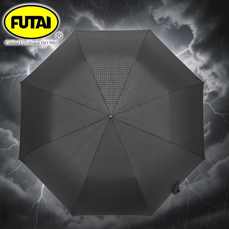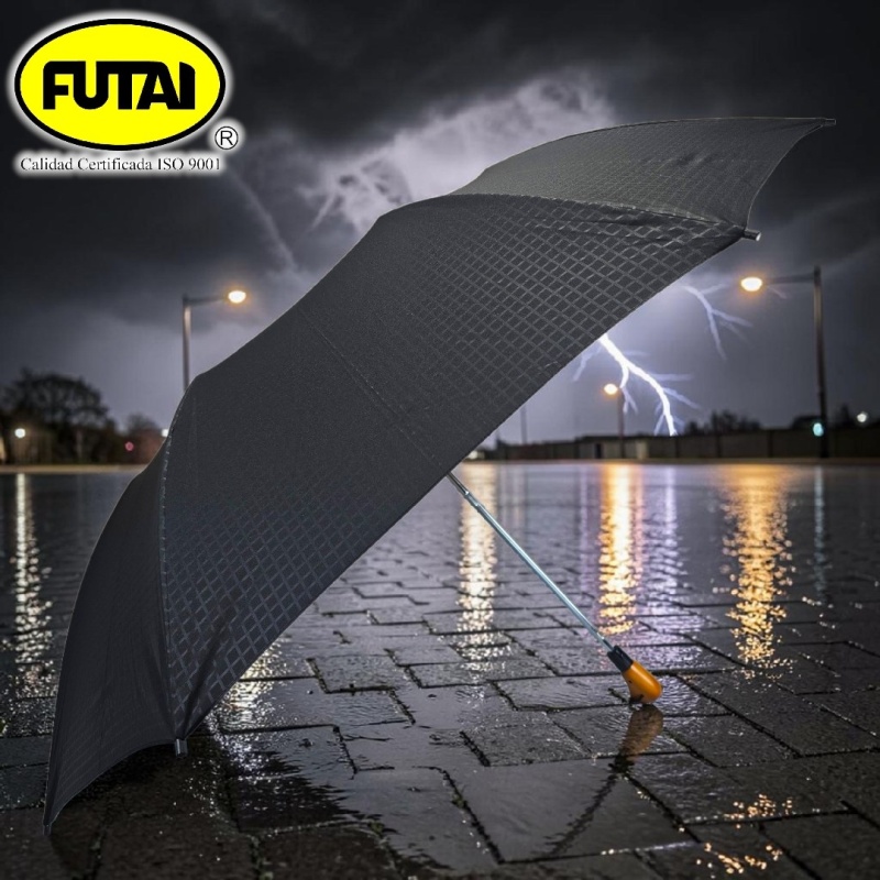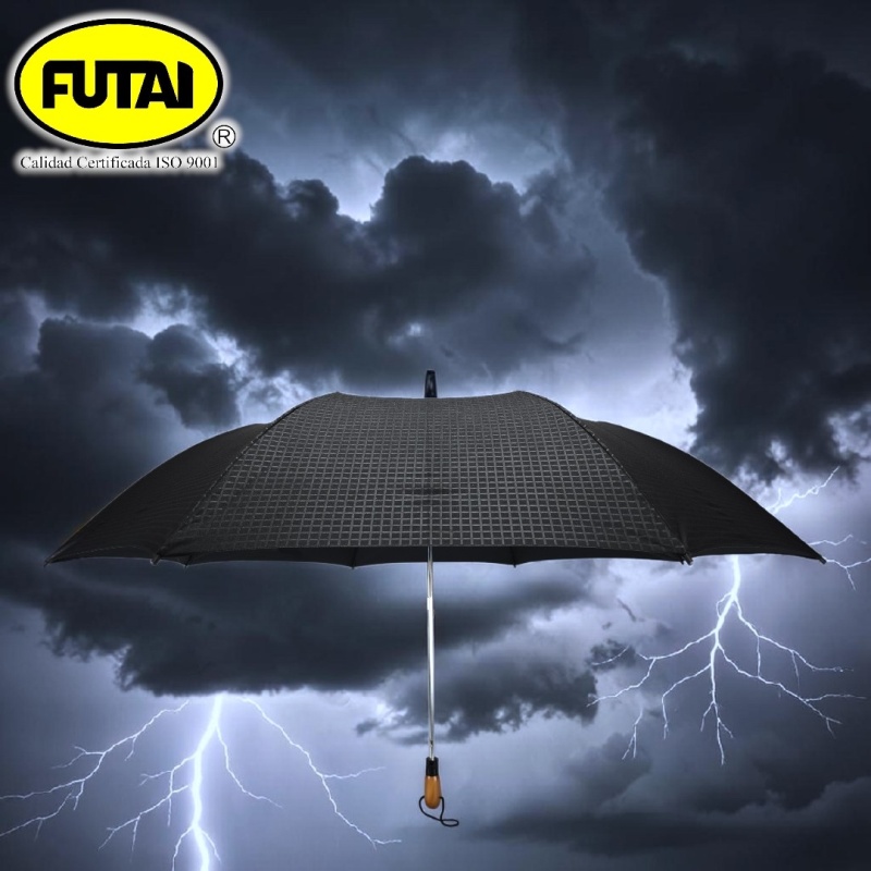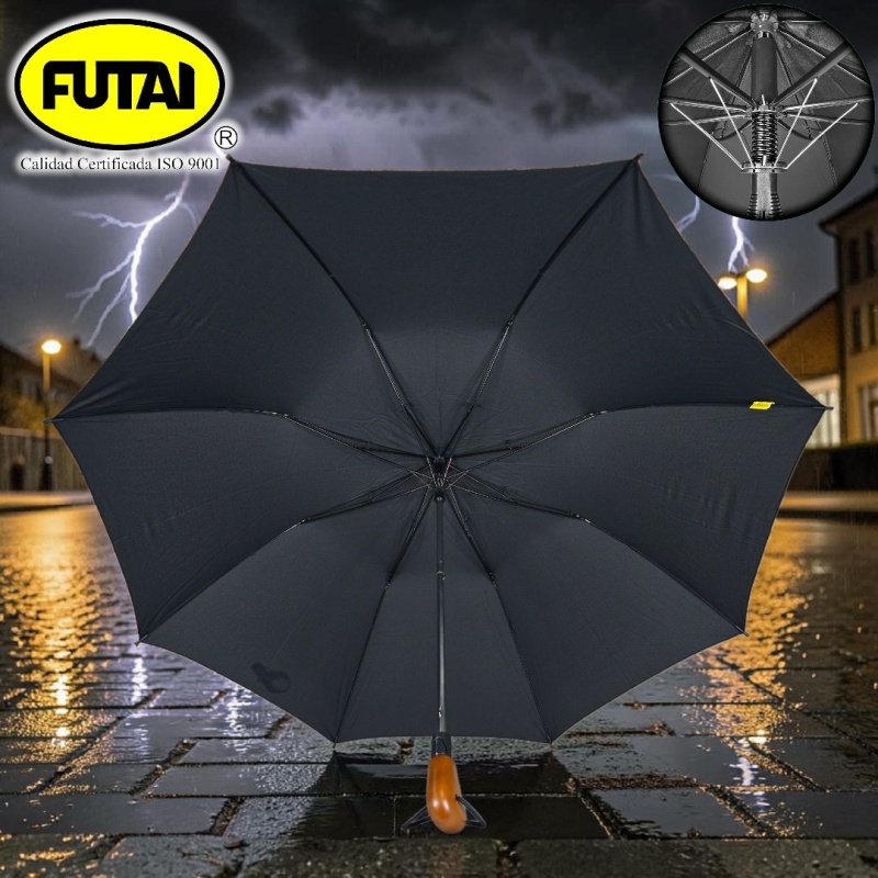 Paraguas semiautomático de dos secciones, ocho varillas de polímero reforzado con fibras (FRP), puntas especiales, tejido pongee 190T con diseño especial, puño de madera, tamaño 28 pulgadas (71 cm) de radio. Disponible en color negro.