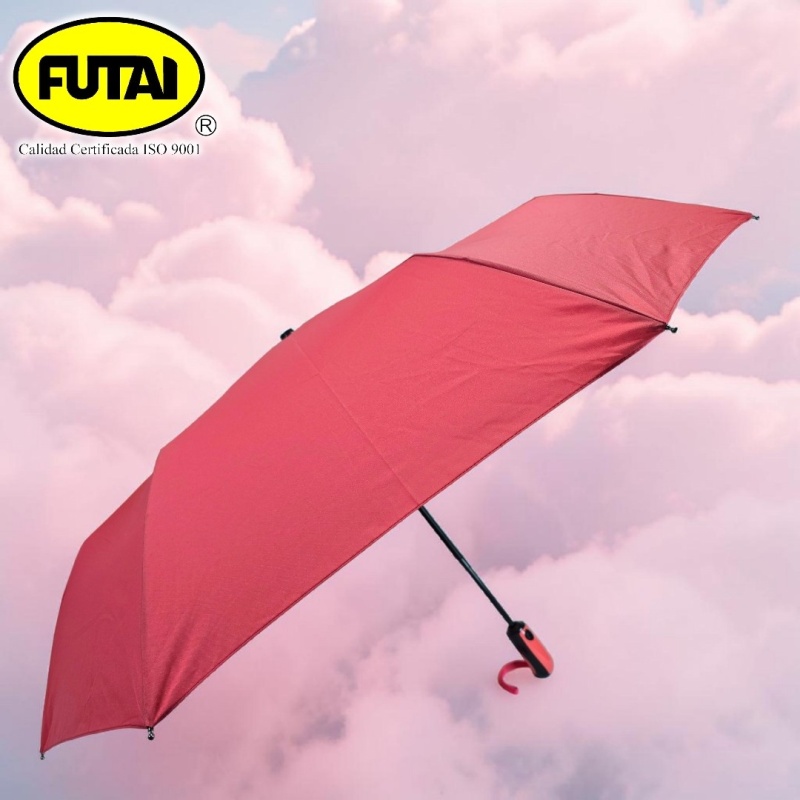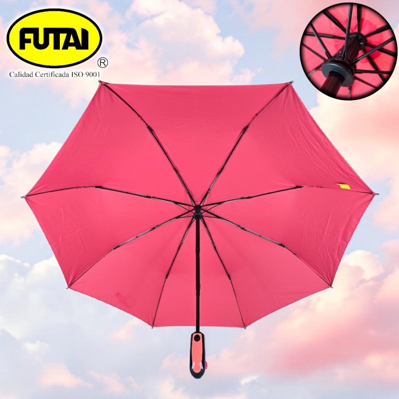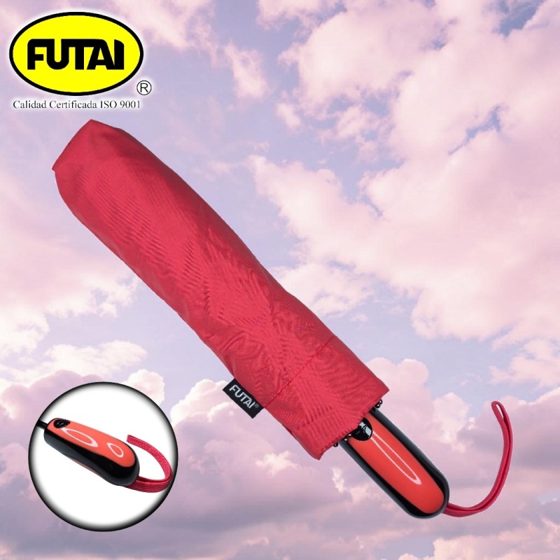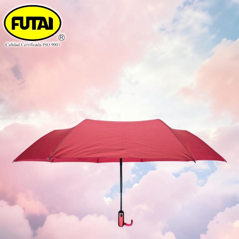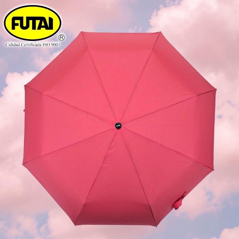Sombrilla automática de tres secciones, ocho varillas de polímero reforzado con fibras (FRP), puntas especiales, tejido pongee 190T, puño acorde al color de la capa, tamaño 24 pulgadas (61 cm) de radio. Disponible en variedad de colores lisos.
