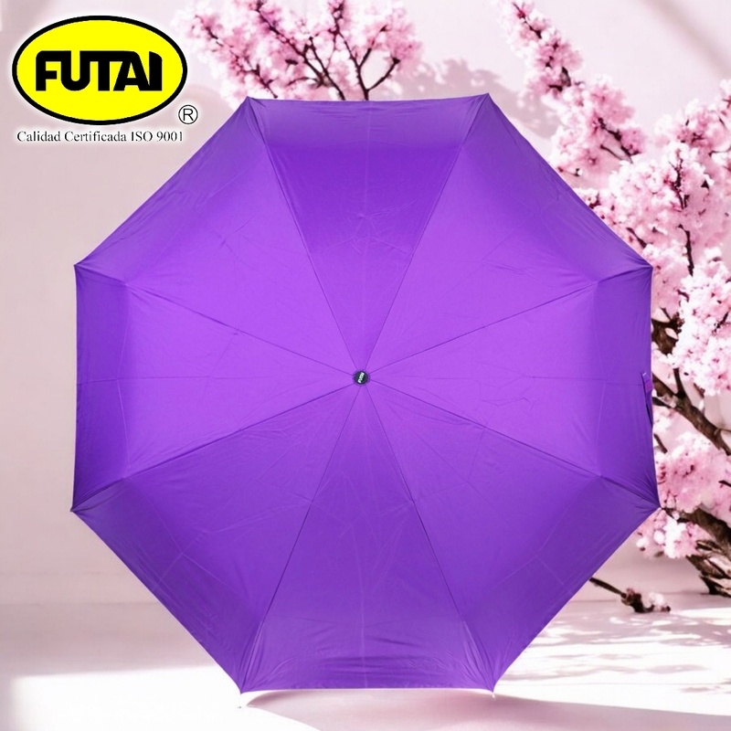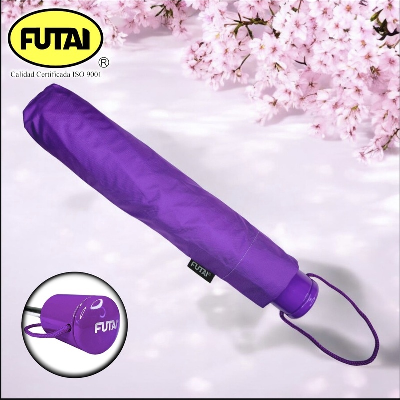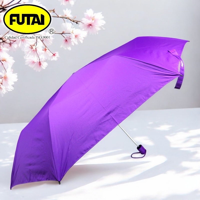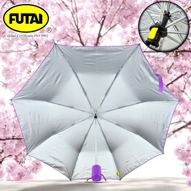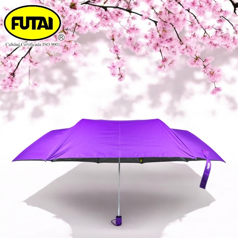 Sombrilla manual de tres secciones, ocho varillas en aliminio y de polímero reforzado con fibras (FRP), puntas especiales, tejido pongee 190T con apa protectora contra los rayos UV, puño acorde al color de la capa, tamaño 28 pulgadas (71 cm.) de radio. Disponible en variedad de colores lisos.