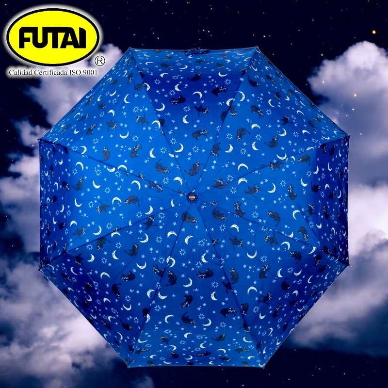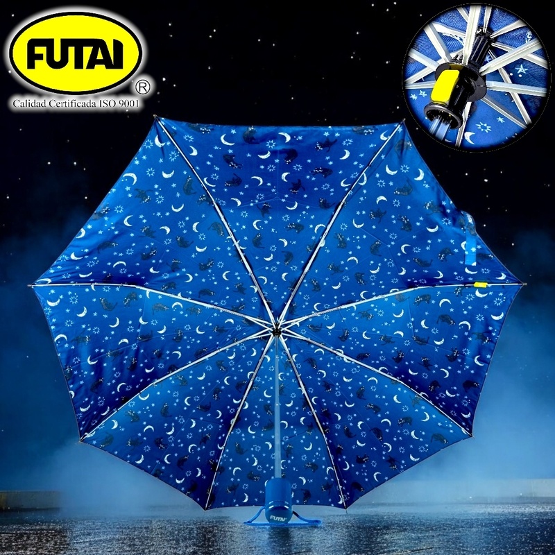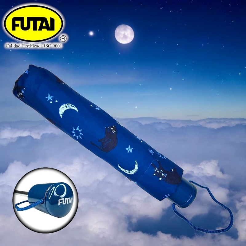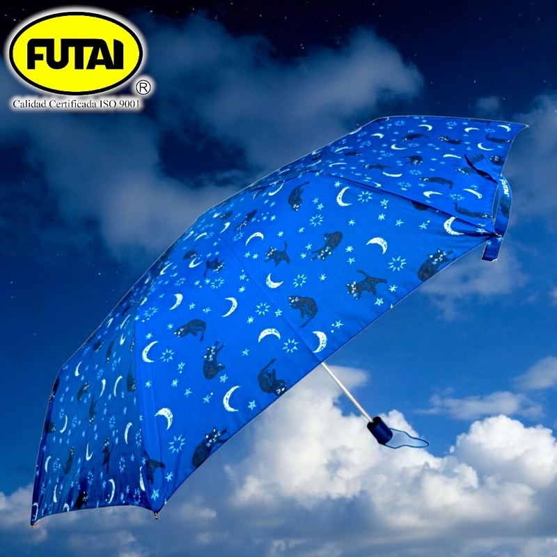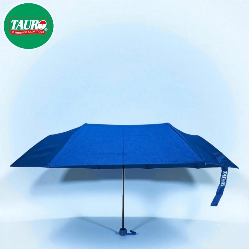 Sombrilla manual de tres secciones, ocho varillas en aluminio y de polímero reforzado con fibras (FRP), puntas especiales, tejido pongee 190T, puño acorde al color de la capa, tamaño 28 pulgadas (71 cm.) de radio. Disponible en variedad de colores estampados.