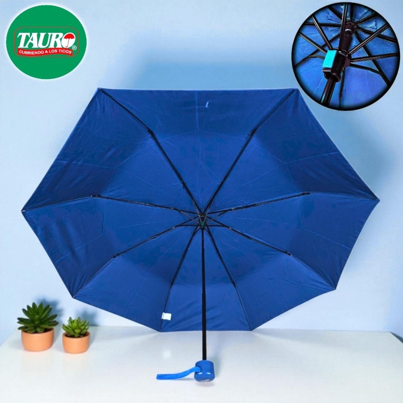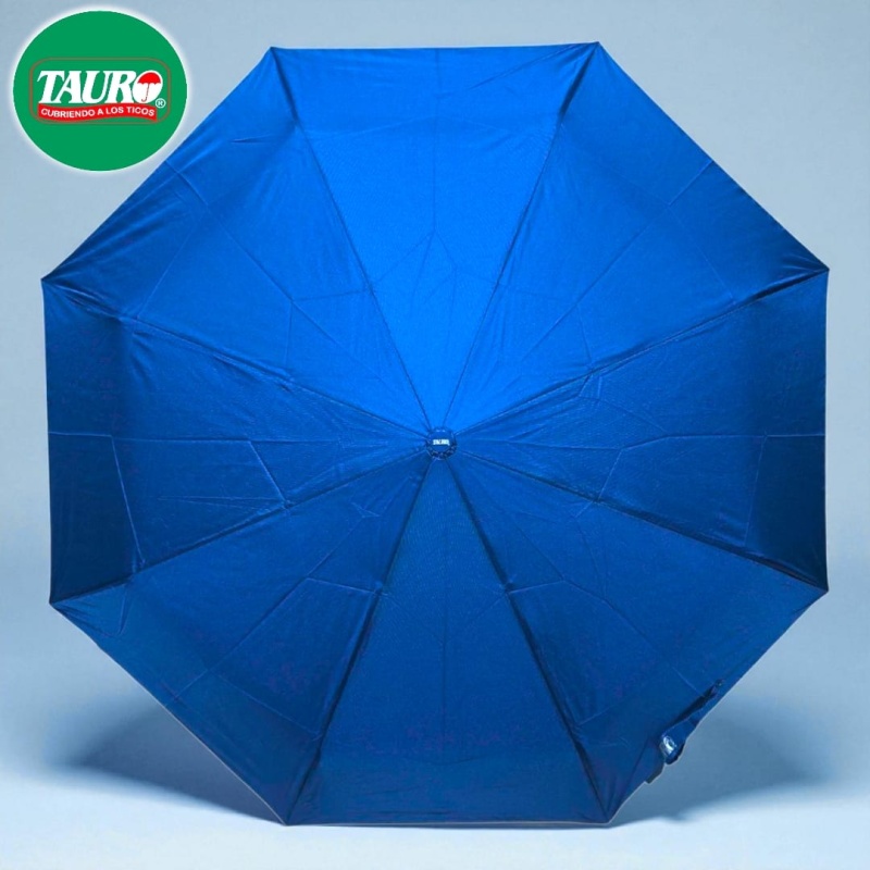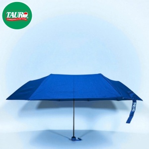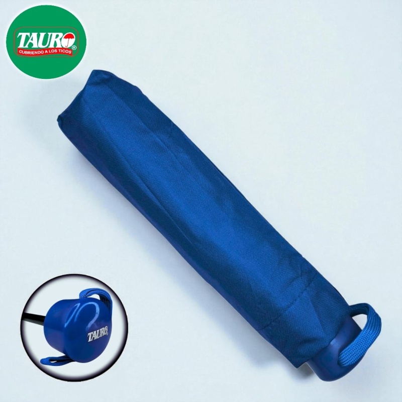 Sombrilla manual de tres secciones, ocho varillas negras de polímero reforzado con fibras (FRP), puntas especiales niqueladas, tejido pongee 190T, puño acorde al color de la capa, tamaño 21 pulgadas (53 cm) de radio. Disponible en color azul.