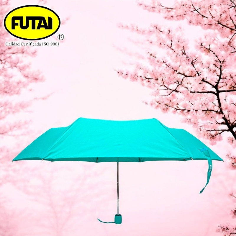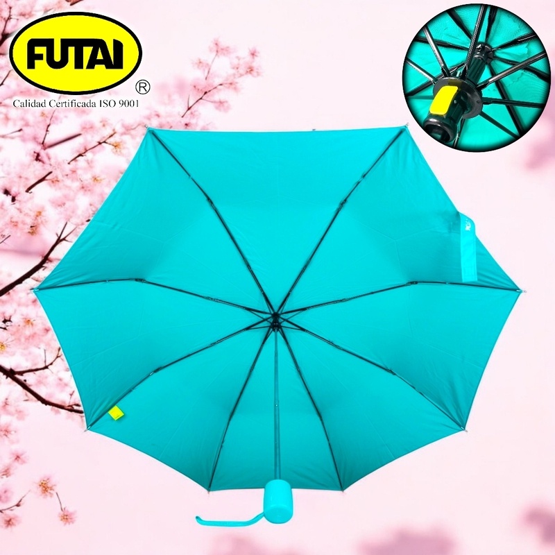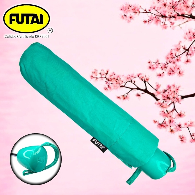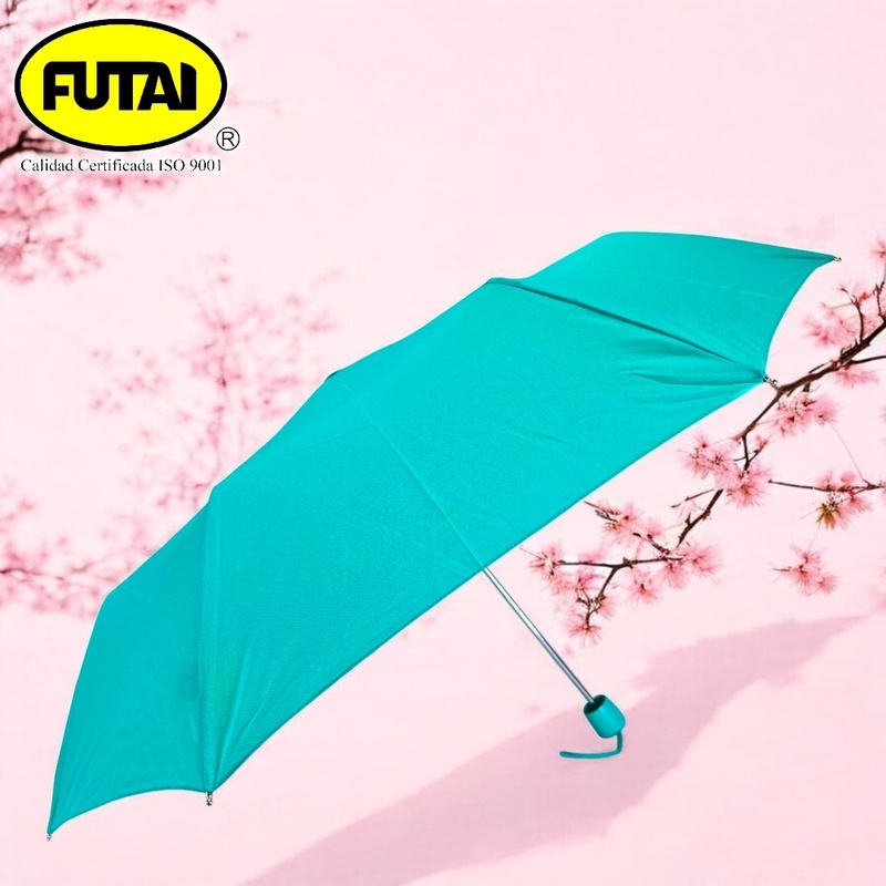 Sombrilla manual de tres secciones, ocho varillas negras de polímero reforzado con fibras (FRP), puntas especiales niqueladas, tejido pongee 190T, puño acorde al color de la capa, tamaño 24 pulgadas (61 cm.) de radio. Disponible en variedad de colores lisos.